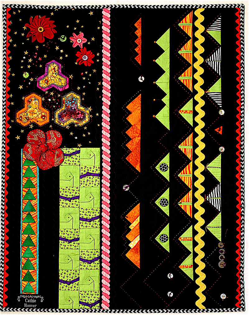 This slide lecture reveals how Cathie found the freedom to use many different fabrics in her quilting and calls the approach "managed" chaos. She will use her travelogue photos in California, Nevada, England, and Morocco to illustrate how and why her exposure to color and design was influenced. Her presentation of lots of quilt images will prove her point!"