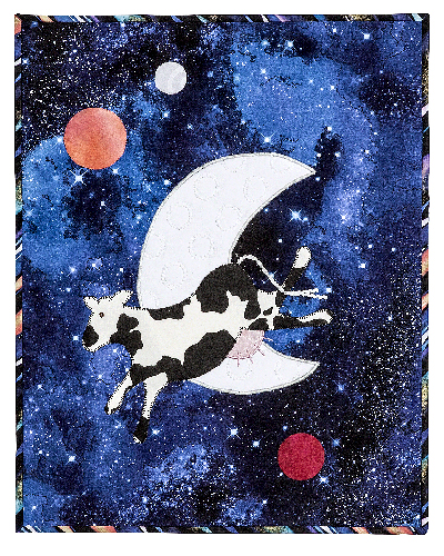 Kit includes: All fabrics for: the incredible universe background, one Holstein cow, one moon, three planets (Jupiter, Mars and Venus), batik backing and comet fabric for binding. |